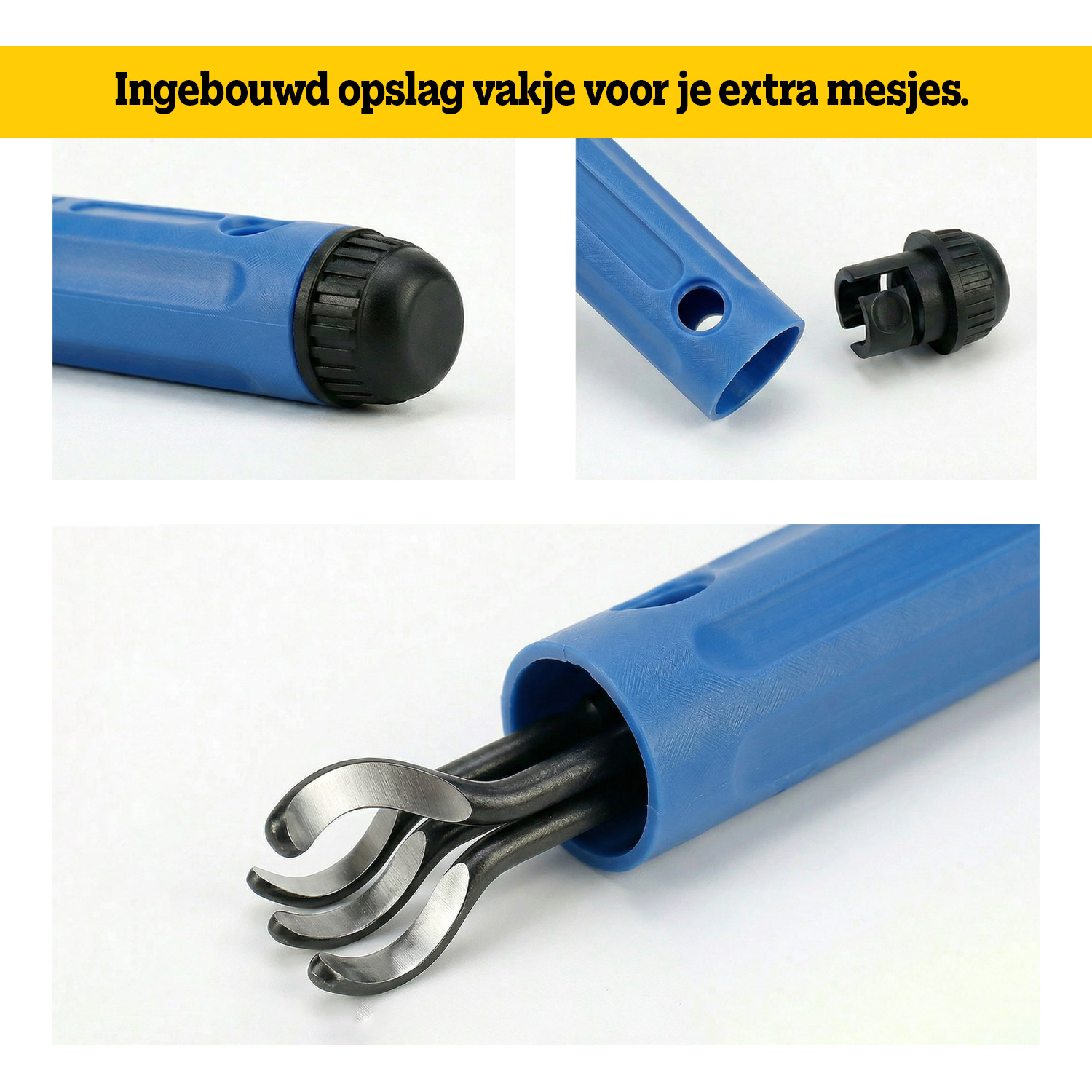 Het afbraammes werkt eenvoudig en effectief. Schuif de reserve mesjes in de houder en vergrendel ze stevig op hun plaats. Het ergonomische ontwerp van het handvat zorgt voor een comfortabele grip en optimale controle tijdens het gebruik. Plaats het mes tegen het materiaal en maak lichte druk terwijl je het mes langs de rand of het oppervlak beweegt. De scherpe mesjes snijden gemakkelijk door bramen en ruwe randen, waardoor je een glad en netjes resultaat krijgt.