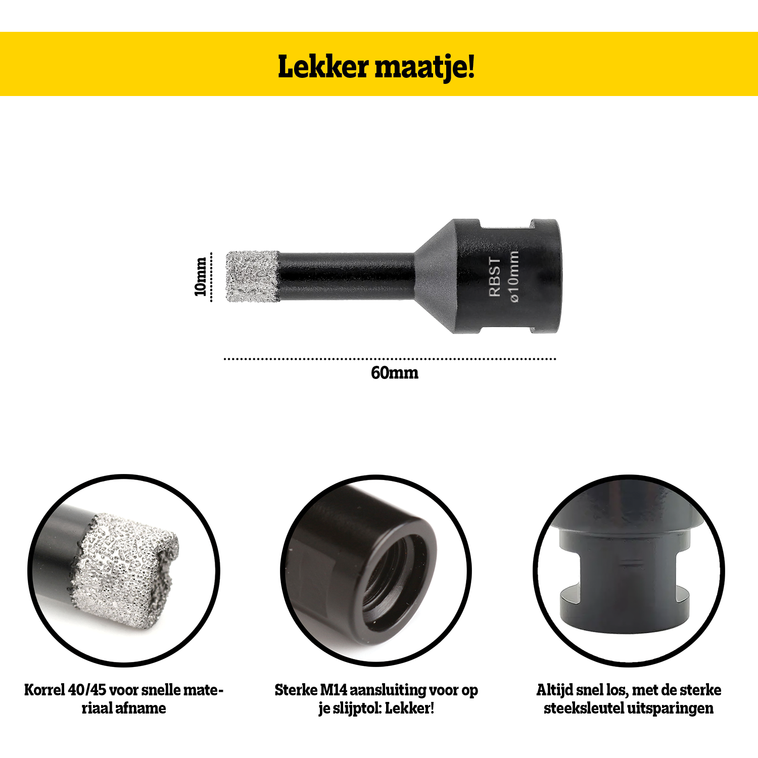 Deze maat is ideaal voor stevige plug en montagegaten in tegelwerk en natuursteen, het monteren van zware badkamer en keukenaccessoires, het plaatsen van wandbeugels en profielen, doorvoeren voor kabels of dunne leidingen, en nauwkeurige gaten in marmer, keramiek of composiet.